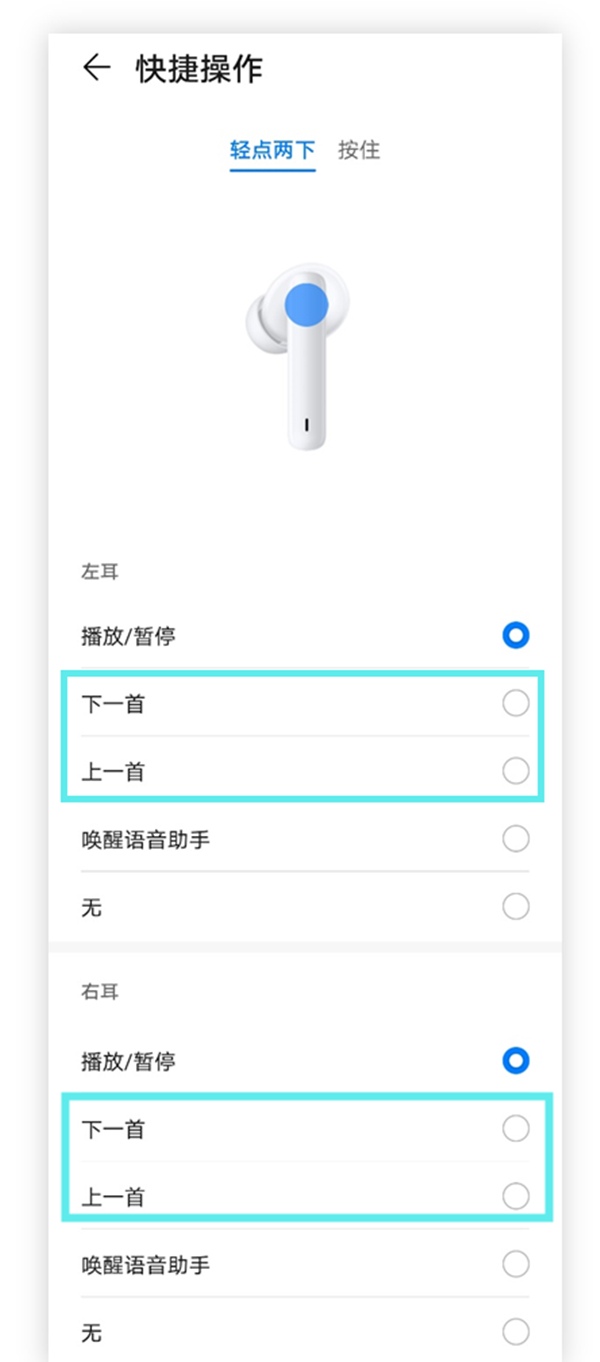 2、在轻点两下页面可以设置左右耳上一首、下一首功能。