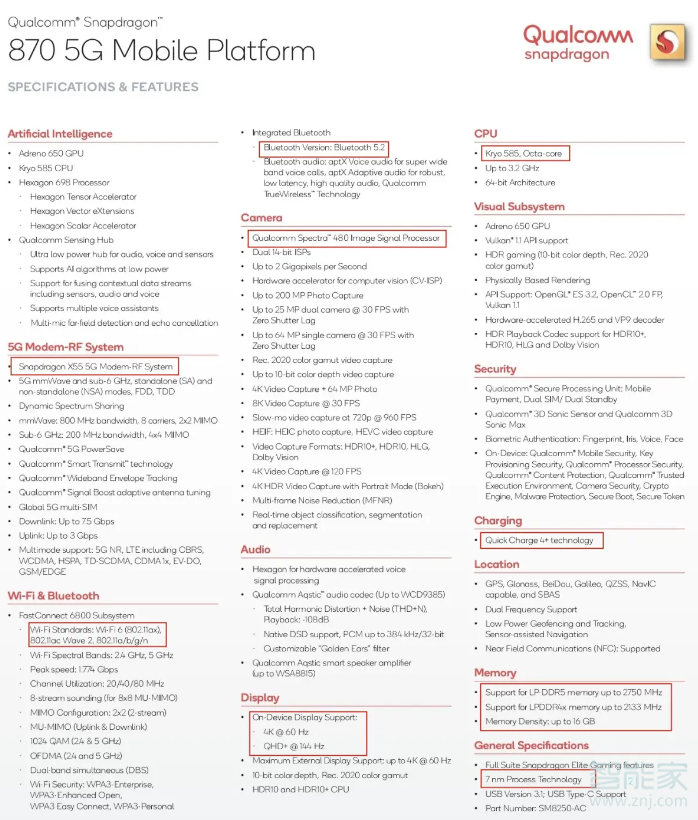 在影像方面得益于Adreno650GPU的强大性能,高通骁龙870可以支持QHD+144Hz屏幕或UHD+60Hz的屏幕显示规格,并支持10-bit色深以及Rec2020色域显示。