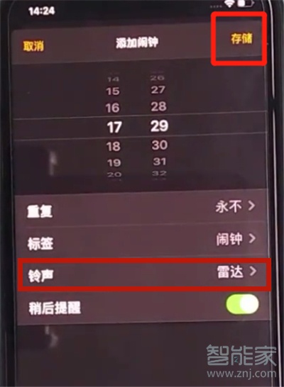 3.设置好你的时间,在铃声那里选择自己需要的铃声,点击存储即可。
