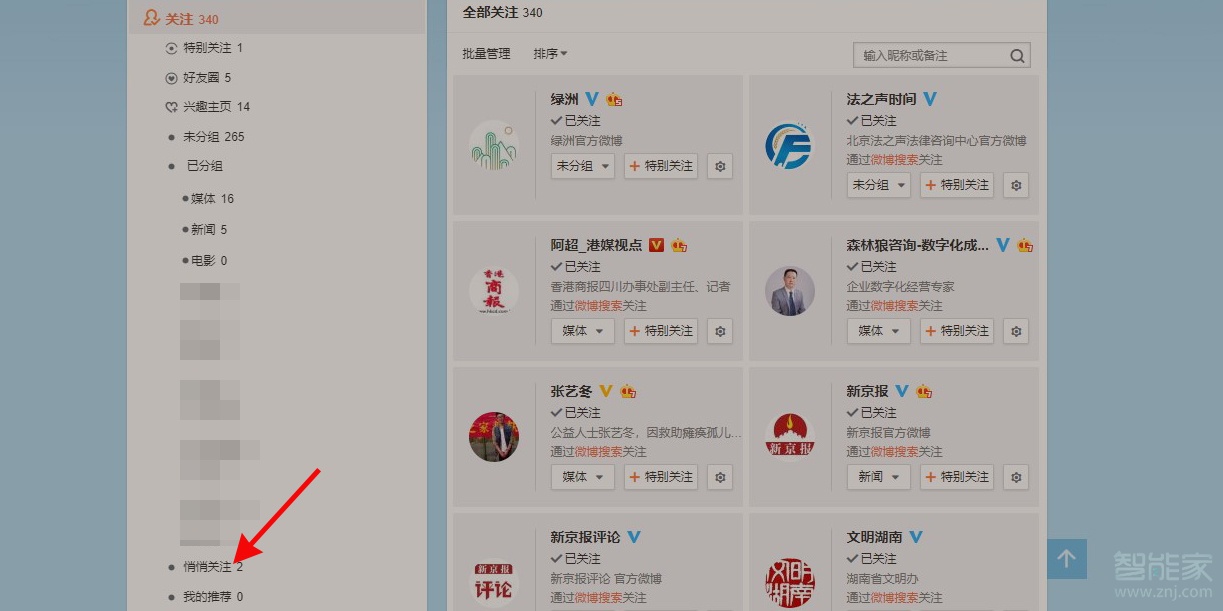 3、点击左侧已分组下面的悄悄关注。