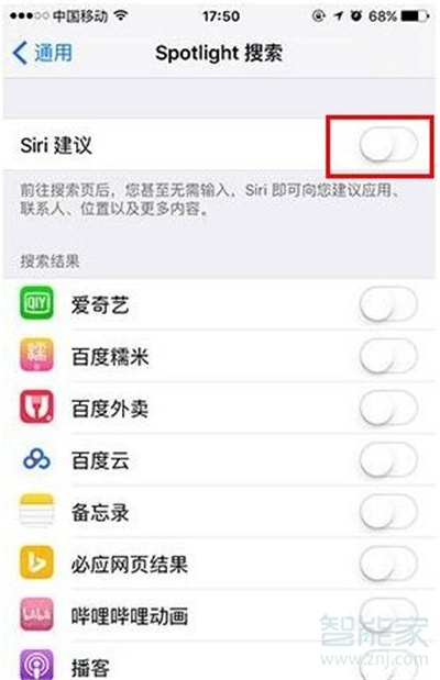3、关闭【Siri建议】可关闭搜索的应用推荐。