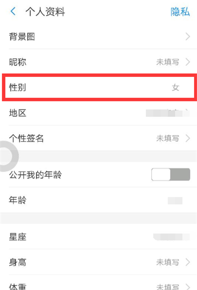 5、找到性别一栏即可查看,发现性别也是不可以修改的。