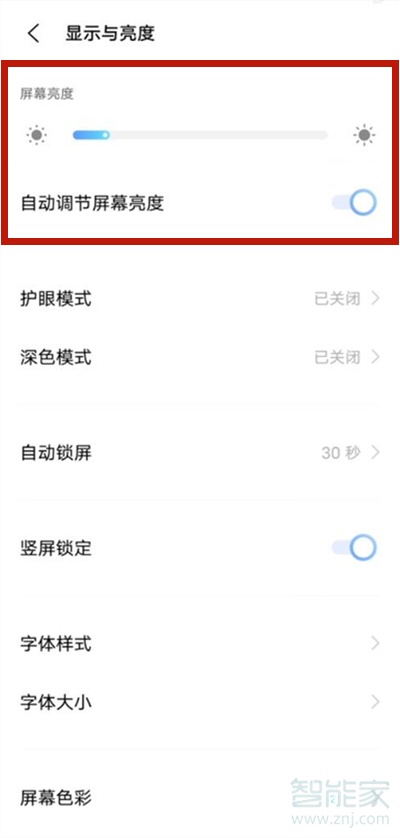 2、可在【屏幕亮度】下方左右滑动小圆点来调节屏幕亮度,也可开启【自动调节屏幕亮度】。