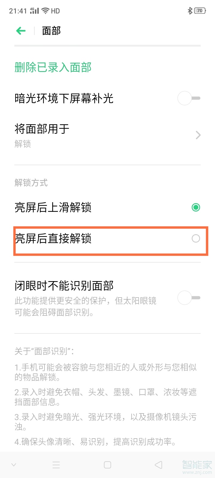 3、点击【录入面部】,录完之后点击【亮屏后直接解锁】即可。