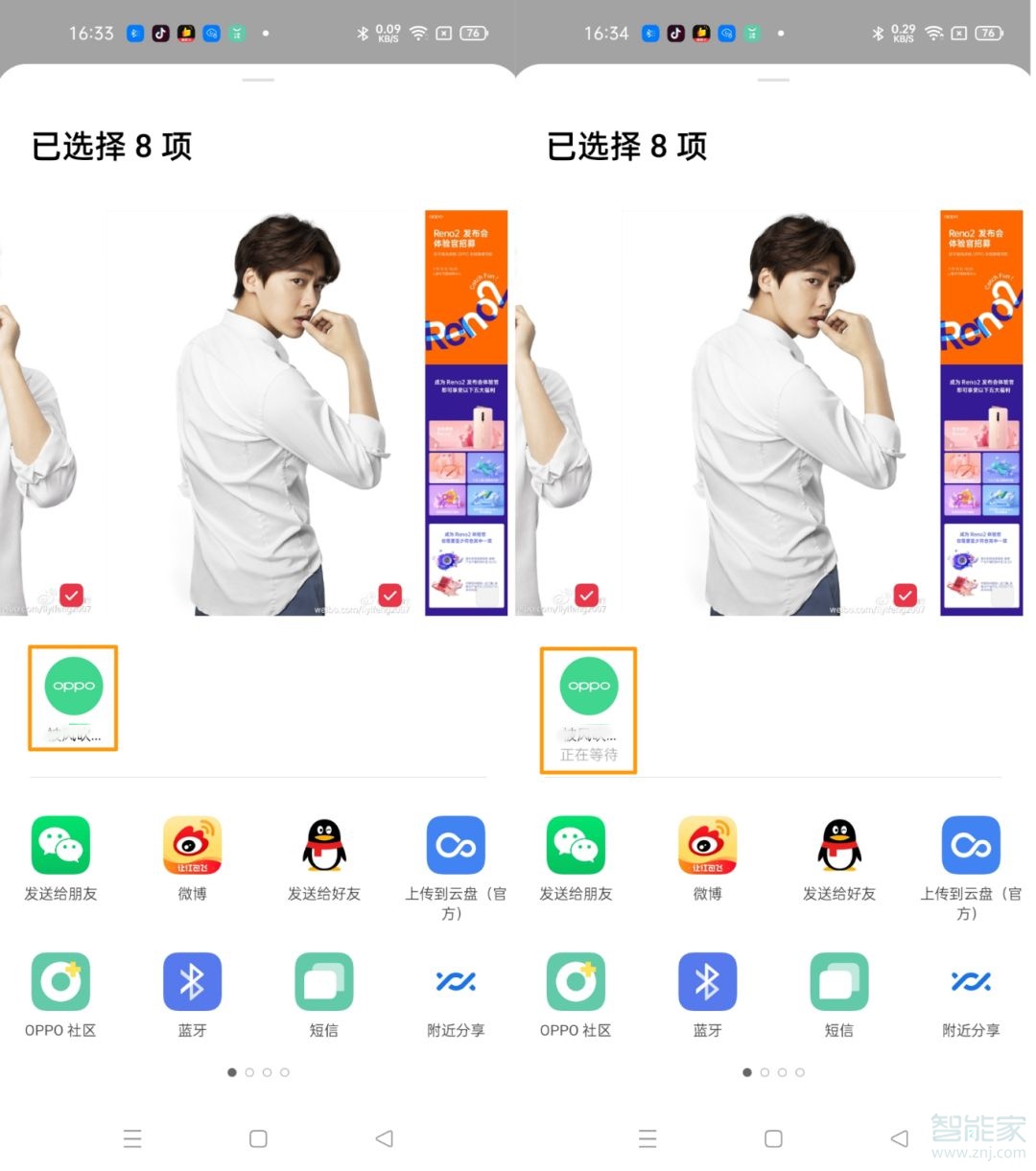 4、这样在传输时会看到相应的机型或者OPPO帐号,点击等待对方接收就可正常传输了。