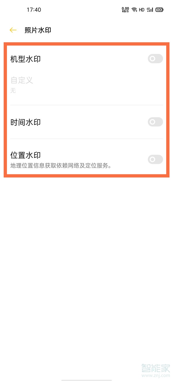 3、打开【机型水印】、【时间水印】、【位置水印】右侧的开关。