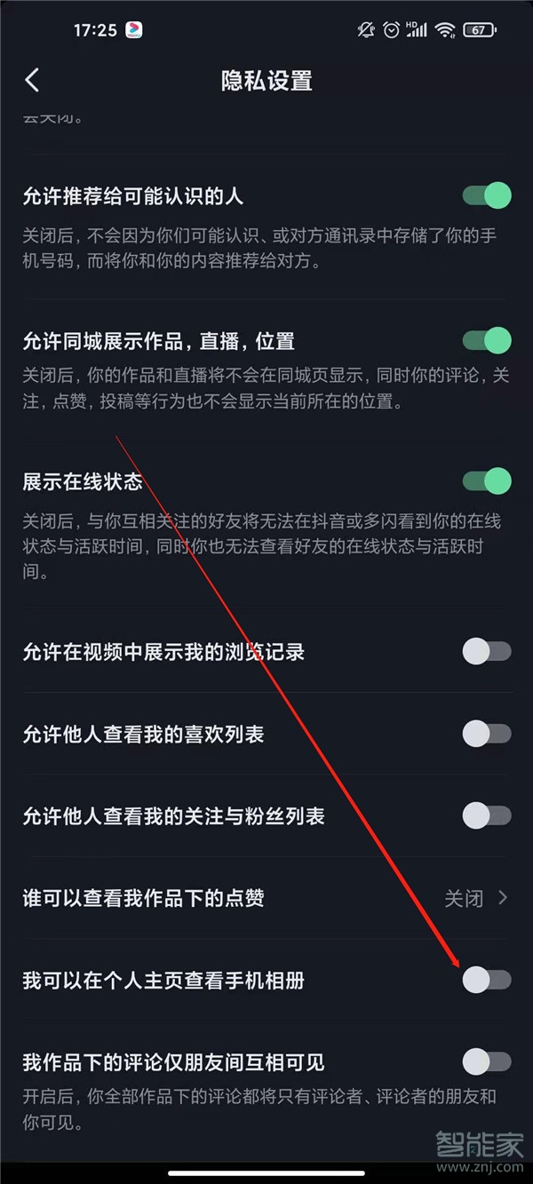 4、关闭【我可以在个人主页查看手机相册】开关即可。