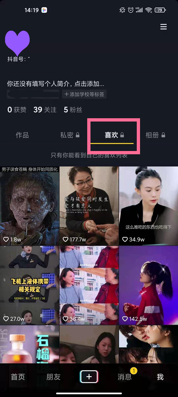 2、点击喜欢选项,点击要取消喜欢的视频。