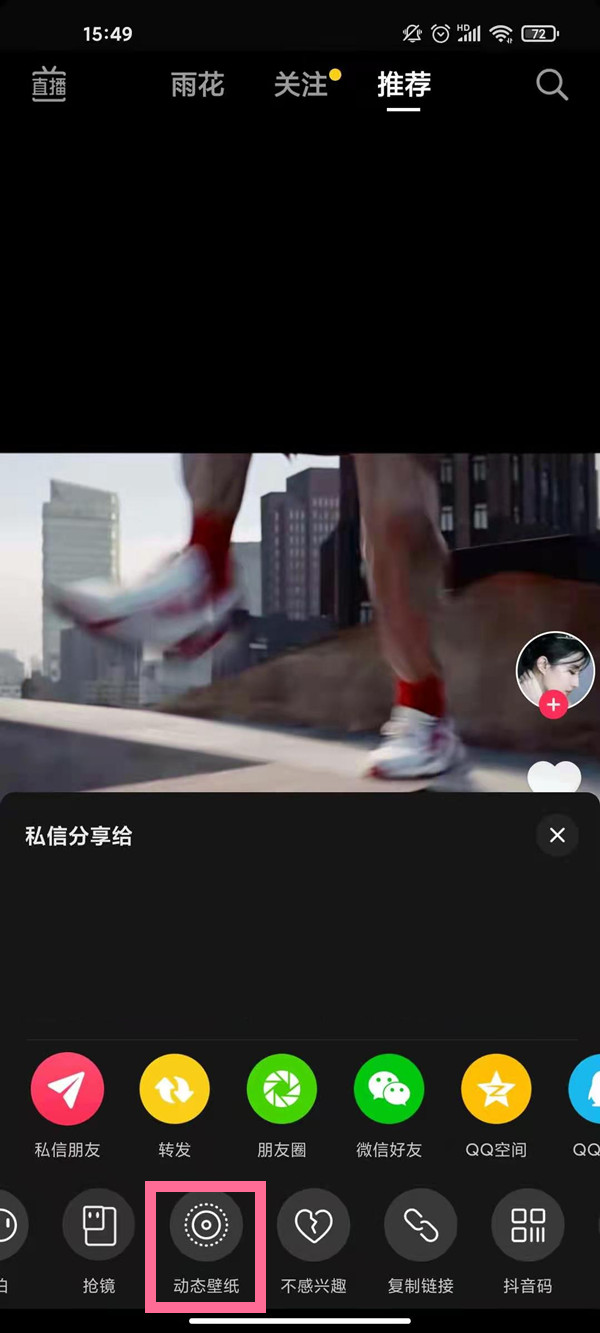 1、打开抖音app,找到想要保存成动态壁纸的视频,点击分享图标。