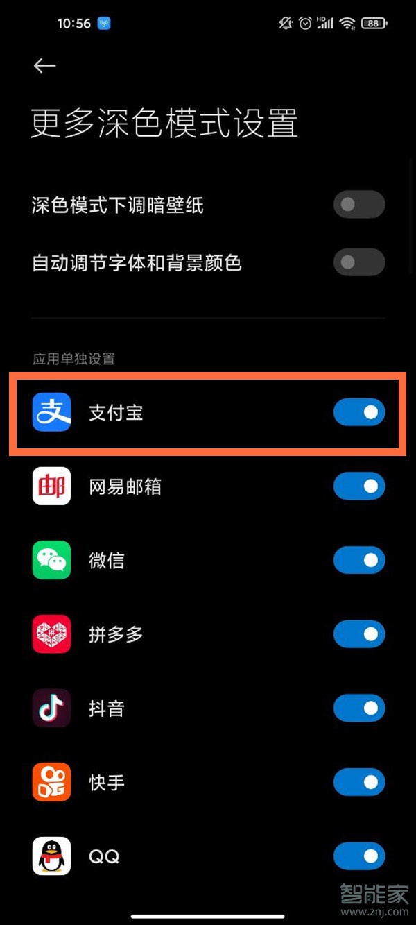 支付宝没有深色模式,但有些手机品牌在系统深色模式中对支付宝进行了适配,可以在系统深色模式中开启 支付宝开关。下面以小米手机为例: