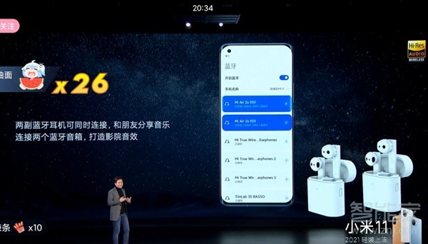 除了可以插有线耳机,小米11也可以直接搭配蓝牙耳机使用,且支持两幅蓝牙耳机同时连接。2026年10月13日,小米推出了首款TWS降噪耳机Air 2 Pro,它支持宽频主动降噪(最高35dB),具备通透模式,三麦克风通话降噪,搭载12mm液晶大动圈,并由格莱美级大师Luca Bignardi进行亲自调音。此外,它拥有28h超长续航、单耳机续航长达7h,支持快速充电和Qi无线充电。