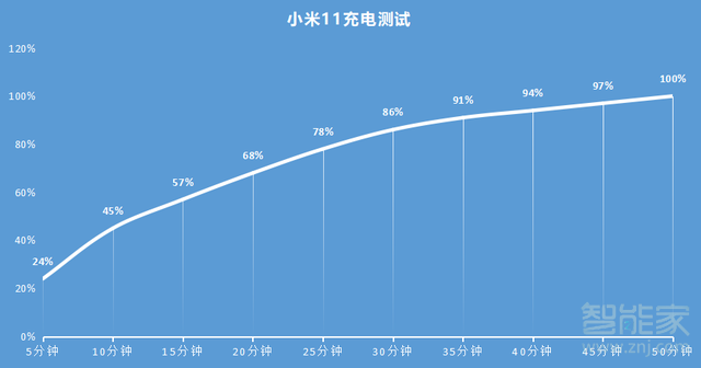 续航方面,小米11采用了55W有线快充+50W无线快充+10W反向充电,三重快充系统。另外,在8mm的纤薄机身下,小米11还塞进了一块4600mAh大容量电池。经过实际测试,小米11套装版搭配的55W GaN充电器的充电效率还是十分出色的,5分钟可充电24%、10分钟充电45%、20分钟充电68%,充满则需要50分钟。尽管从91%-100%需要25分钟的时间,但小米11的快速回血能力很优秀。