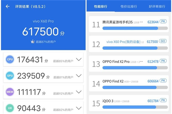 vivox60pro安兔兔跑分多少?vivox60pro手机的安兔兔跑分成绩为617500分,其中CPU成绩176431分,GPU成绩为239509分,MEM成绩为111117分,UX成绩则是90443分。