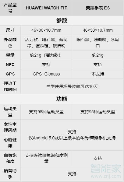 HUAWEI WATCH FIT支持96种运动类型,支持连续血氧饱和度测量和GPS+Glonass。而荣耀手表ES支持95种运动类型,支持血氧饱和度测量,不支持GPS。