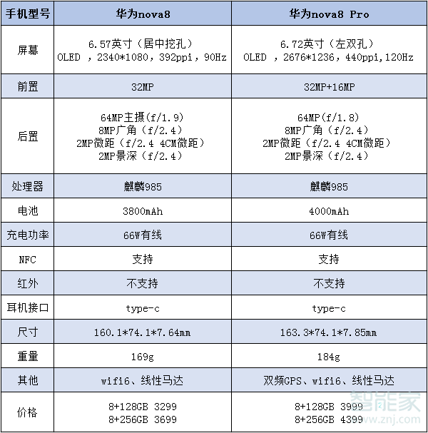 华为nova8和nova8pro的区别?详细参数对比图: