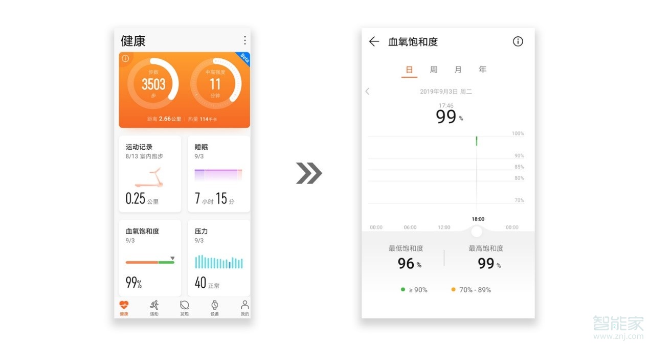 2、血氧饱和度历史记录查看:进入华为运动健康App首页血氧饱和度卡片,可查看血氧饱和度历史记录。App显示的是倒柱状图。