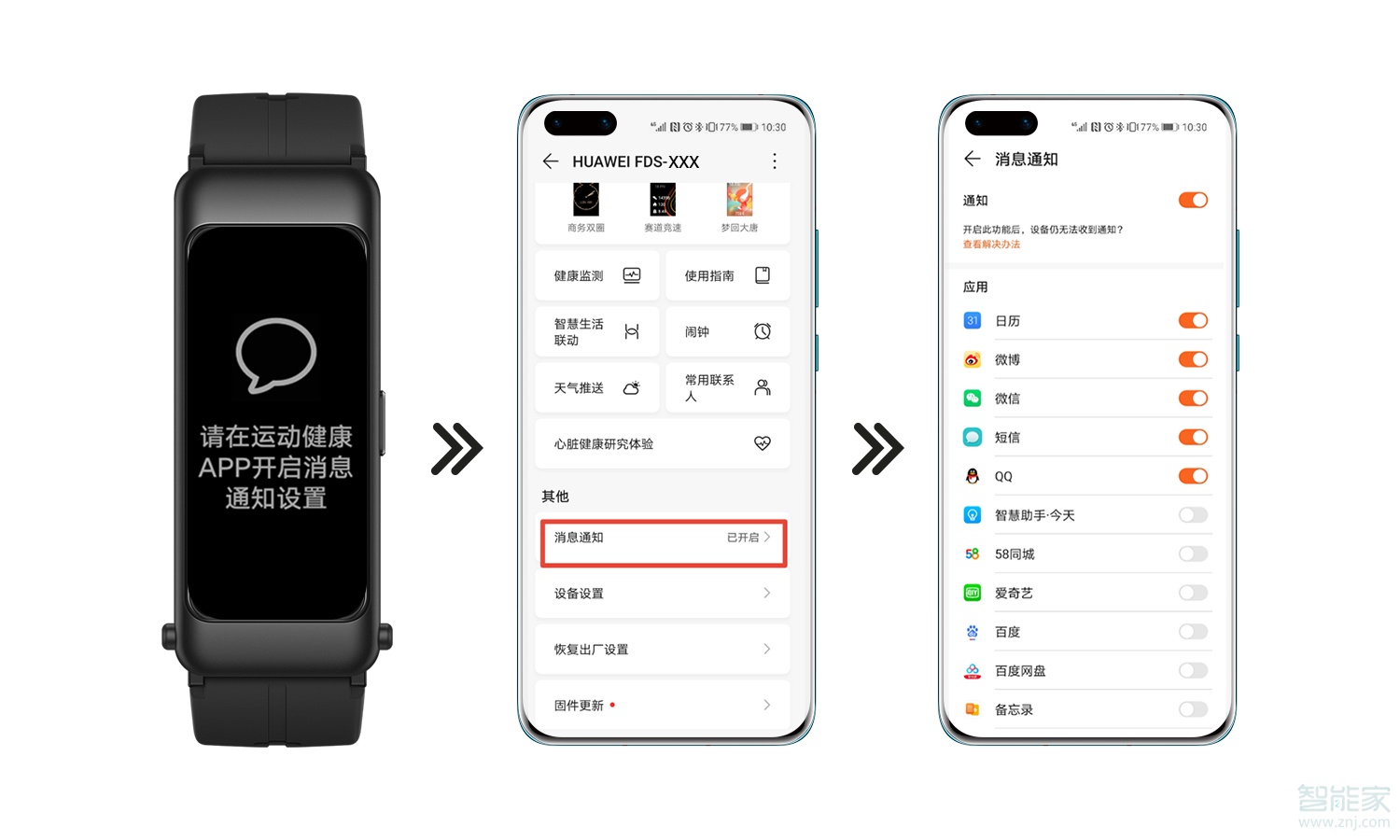 华为手环b6微信提示怎么设置1、在华为运动健康App的设备 界面>点击已经连接的手环>下滑找到 消息通知>开启 通知 选项。您还可以在通知页面的应用选项中,管理开启具体通知消息的应用。