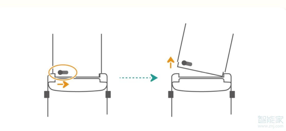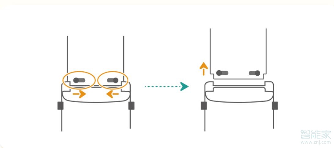 拆卸时拨动表带固定按钮,向上抬起将表带取出,然后释放表带固定按钮。采用向反的操作可以安装新表带。