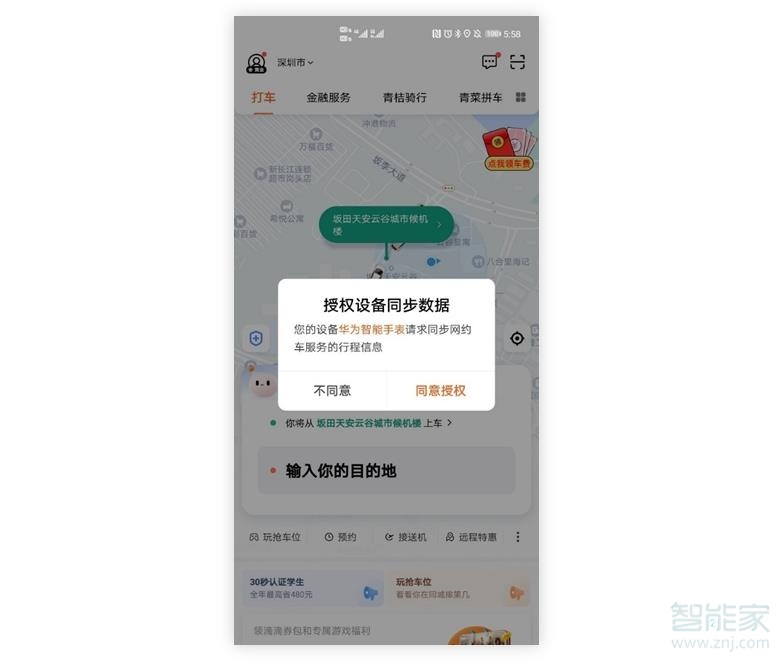 4、 当滴滴出行App页面弹出“授权设备同步数据”提示框之后,选择“同意授权”并开启全部允许授权按钮,之后点击“确认”完成手表与手机的数据同步操作。