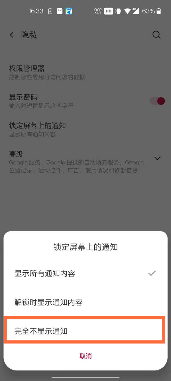 2、点击【锁定屏幕上的通知】选项。