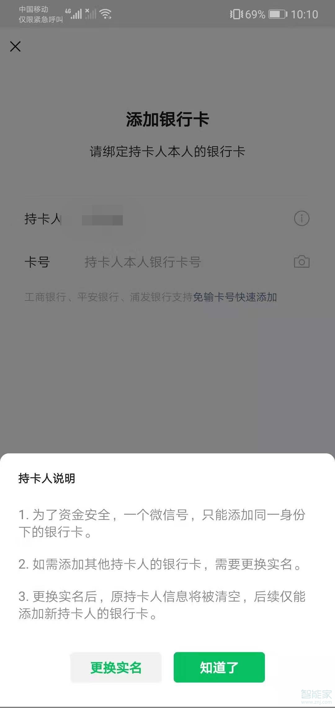 5、更换持卡人会有如下提示:一个微信号只能添加同一身份银行卡,添加其他持卡人需要更换实名