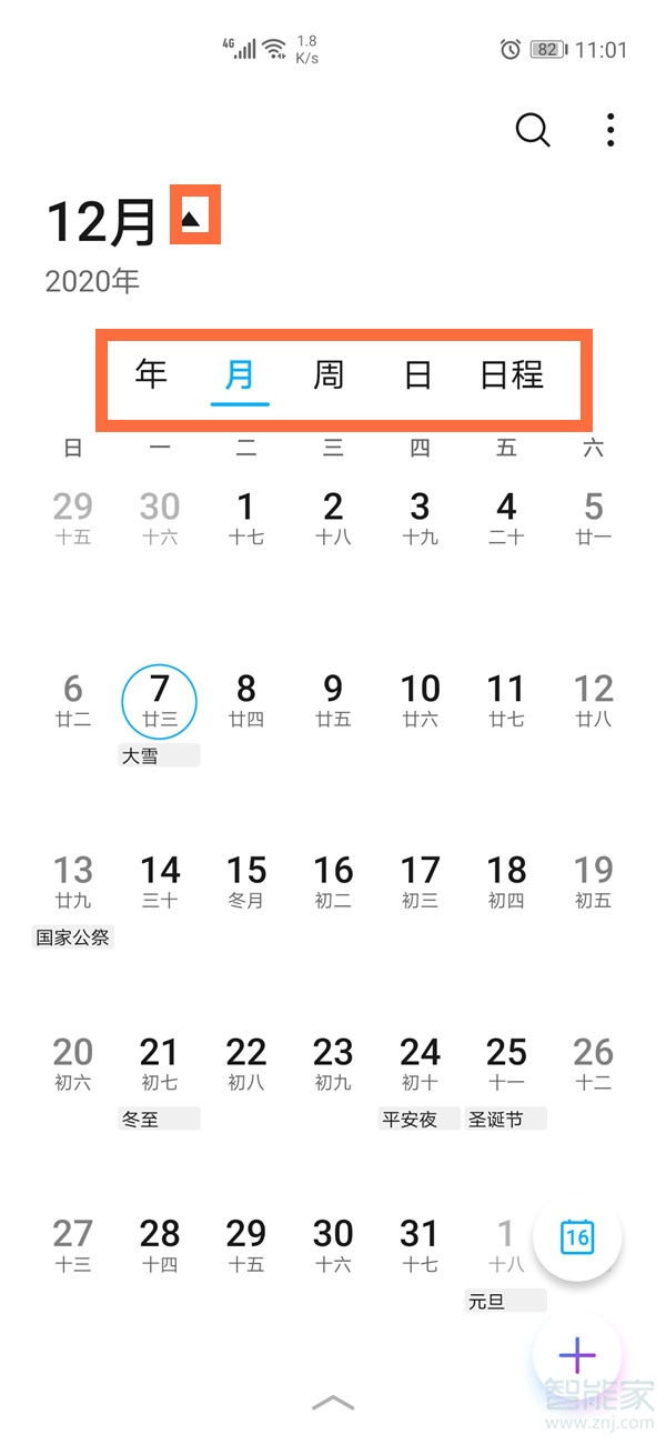1、打开日历,点击月份旁边的三角,点击下方的年/月/周等可设置按年/月/周/日显示。