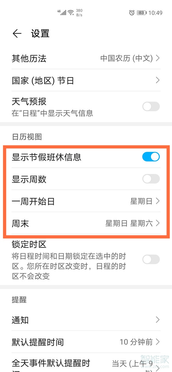 3、还可以设置在日历中是否显示节假班休信息、是否显示周数、一周开始日等。