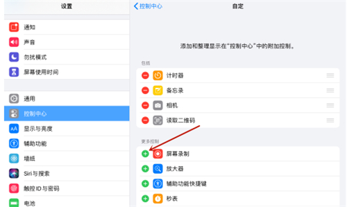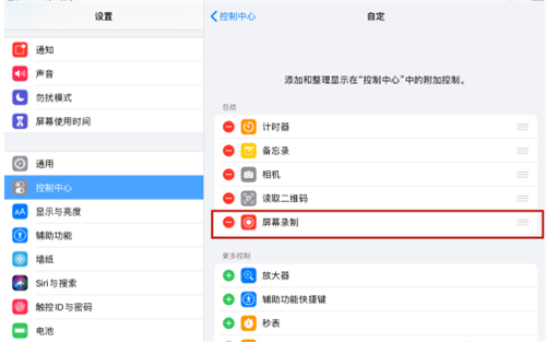 3、点击屏幕录制左方的“+”号,将屏幕录制功能添加到控制中心。此时屏幕录制功能左边显示”-“图标,代表已经添加到控制中心完成。