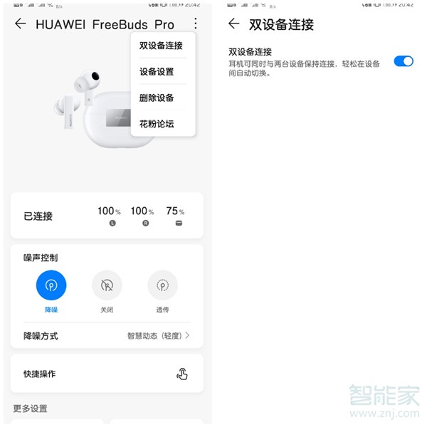 华为freebudspro支持双设备连接,但不支持两个耳机单独连接不同设备。双连接功能支持手动关闭,打开智慧生活app首页,点击耳机卡片右上角设置菜单,开启/关闭双设备连接功能。