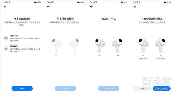 正确佩戴好华为freebudspro耳机后后,你还可以根据耳塞贴合度检测界面指示进行检测。打开智慧生活app,点击耳机卡片进入详情页,点击耳塞检测,根据页面提示操作即可。值得一提的是,如果佩戴感觉已经比较舒适了,但检测结果为不佳,建议以个人降噪效果、佩戴舒适性为准,贴合度检测仅作为佩戴参考。