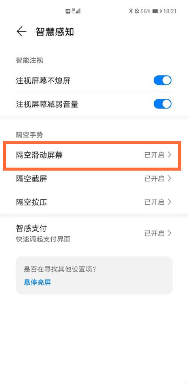 3、点击【智慧感知】,点击【隔空滑动屏幕】,然后打开隔空滑动屏幕开关即可。
