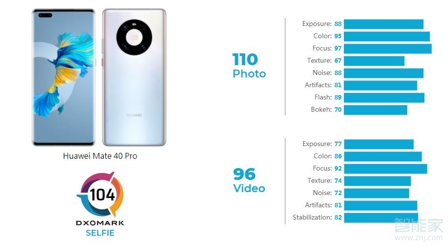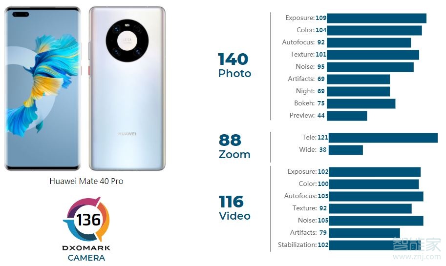 华为mate40prodxo分数?华为mate40pro的DXO综合成绩为136分,其中拍照140分,自拍104分,变焦88分,视频116分。