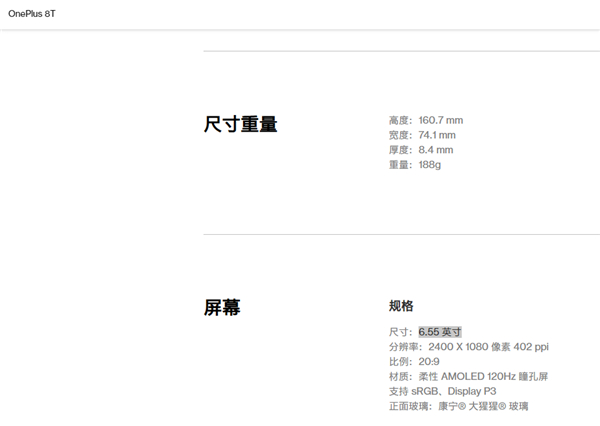 一加8t重量?一加8t手机重量为188g,机身尺寸为160.7mm×74.1mm×8.4mm。它搭载骁龙865处理器,采用LPDDR4X+UFS 3.1闪存,支持nfc和Wi-Fi 6,配备双扬声器和双闪光灯。