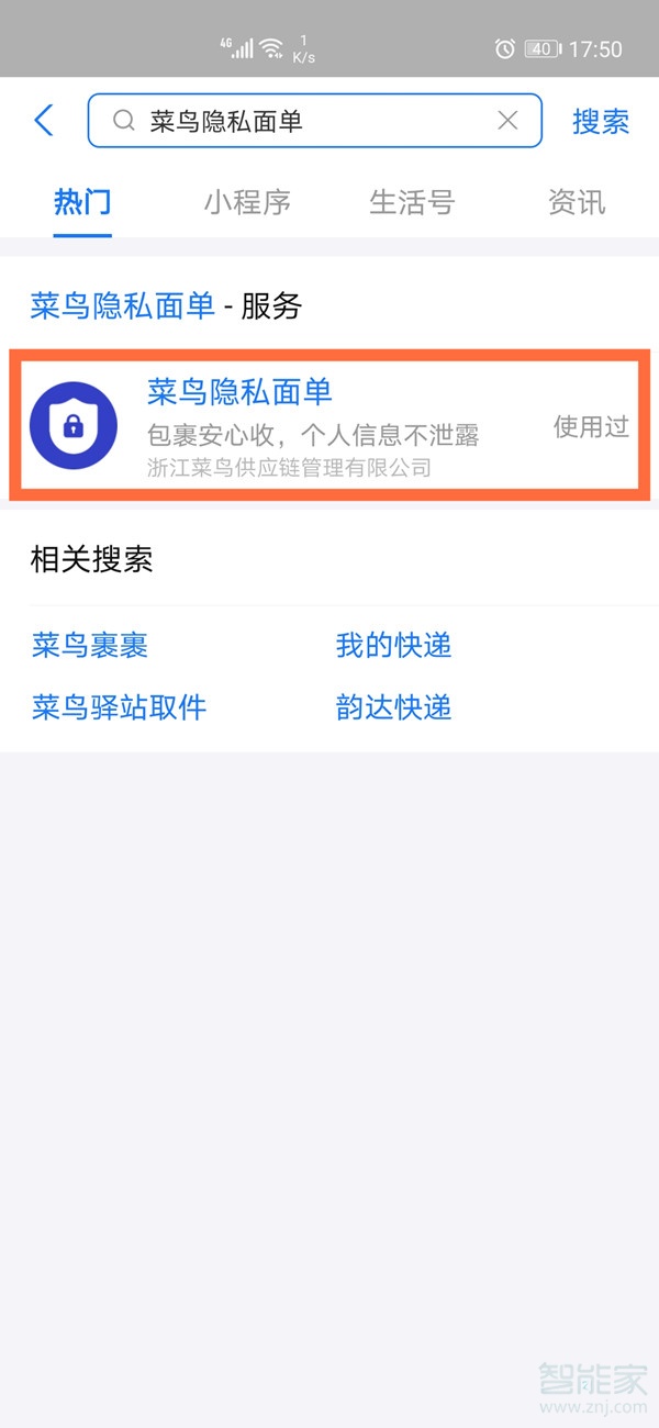 1、打开手机上的支付宝,在搜索框中输入【菜鸟隐私面单】