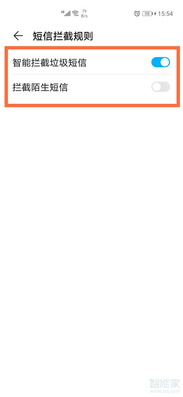 4、关闭【智能拦截垃圾短信】、【拦截陌生短信】开关。