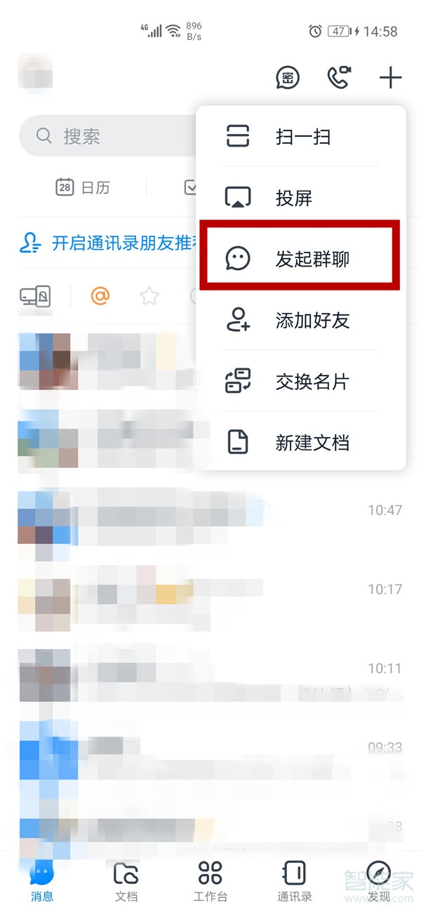 1、打开钉钉,在消息界面点击右上角【+】,选择【发起群聊】。