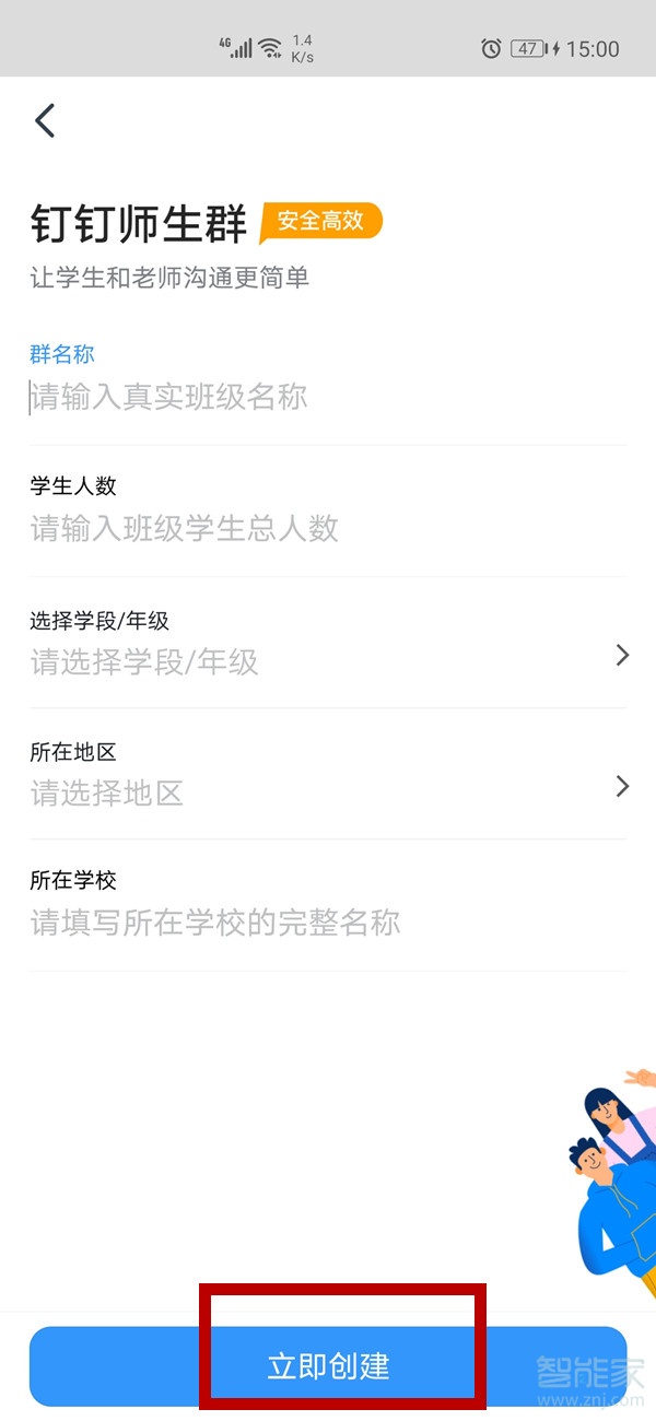 4、输入群名称、学生人数、所在点去、所在学校等信息后点击【立即创建】即可。