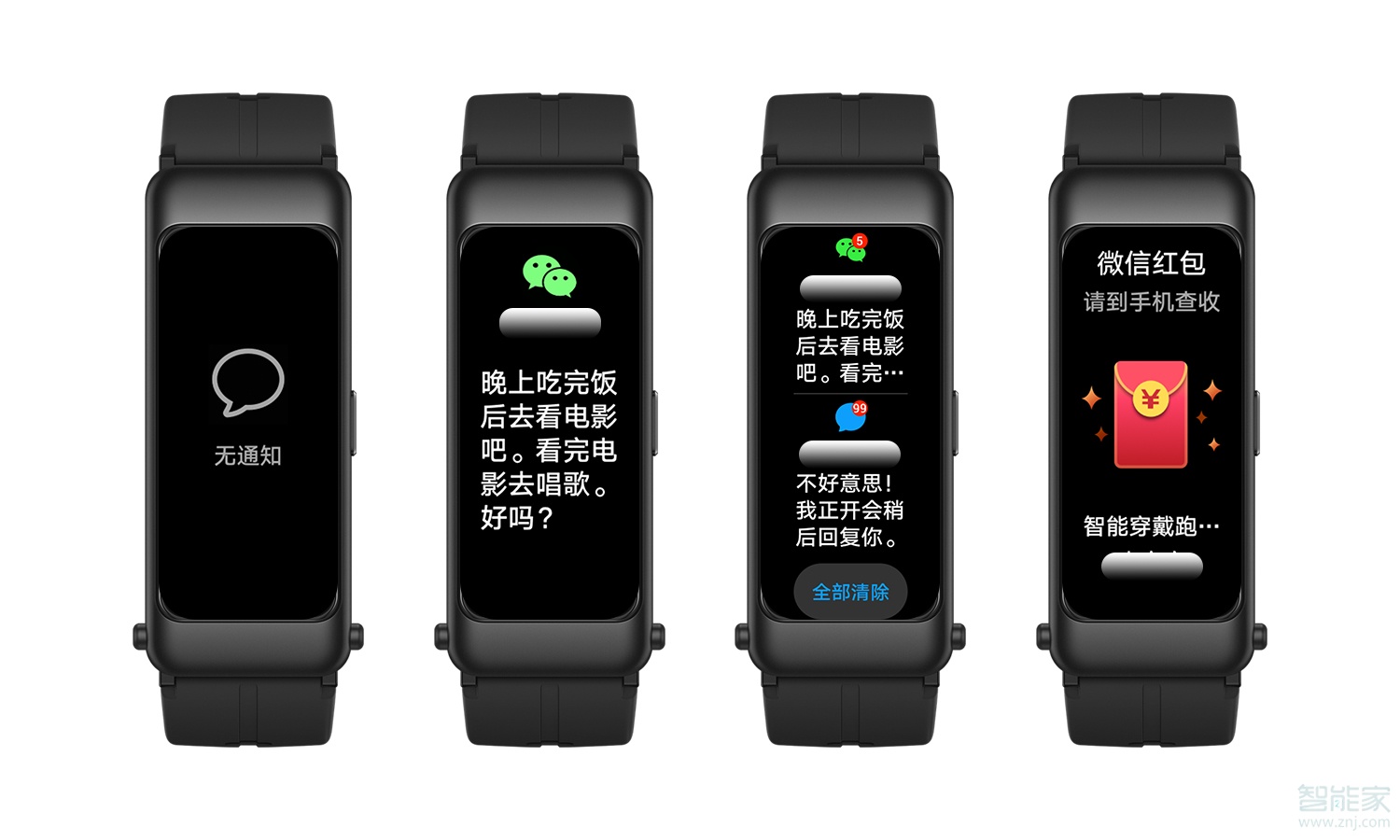 当收到微信红包时,手环屏幕显示“红包来了”画面,并振动提醒。点击红包即可进入正常消息界面,但手环无法打开红包,请及时在手机微信中抢红包。