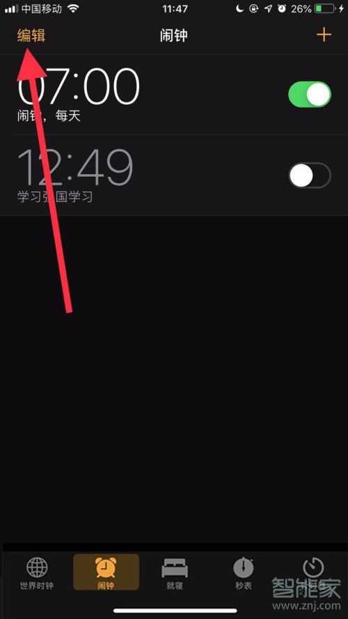 1、打开时钟app,在闹钟界面点击左上角的【编辑】。