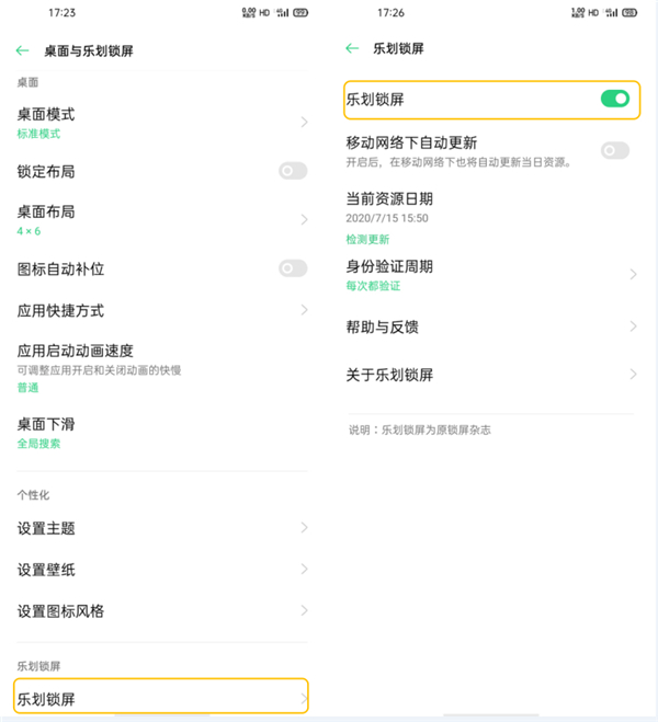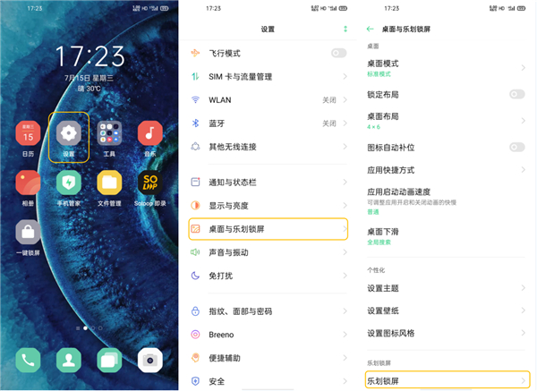 1、进入手机【设置】—【桌面与乐划锁屏】—【乐划锁屏】。