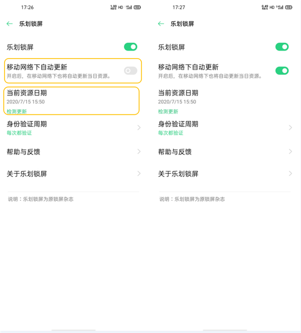 3、锁屏杂志默认是在WLAN网络下进行更新的,当然也可以选择将【移动网络下自动更新】打开,或者选择手动【检测更新】。