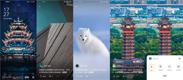 4、这样操作是不很简单啊,赶紧设置然后锁上屏幕看看吧。在锁屏界面左右滑动还可以切换画面,并且可以保存图片(点击屏幕下方的三点图标—点击保存图片即可)。