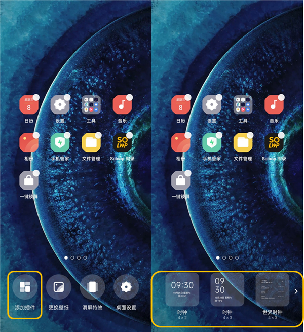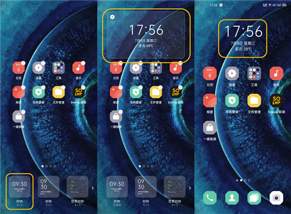 3、如果想添加什么插件,直接点击相应图标桌面就会显示。就以“时钟”插件为例,点击一下时钟插件图标,就会在桌面显示已添加时钟插件,还可以将其进行移动到不同的位置放置,调整好位置后返回即可,如下图: