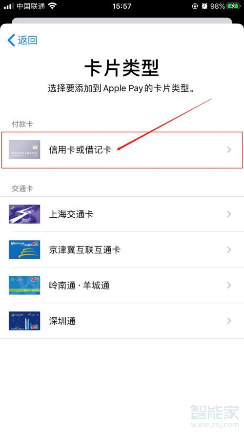 3、在卡片类型界面选择“信用卡或借记卡”。