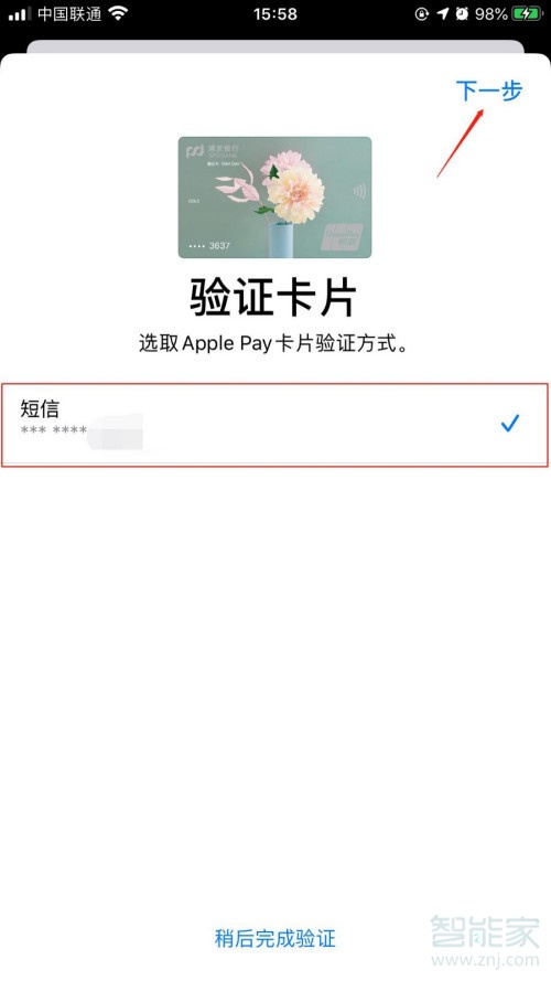 5、输入银行卡绑定的手机号码收到的验证码用以验证卡片。