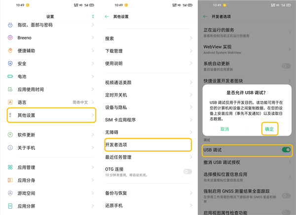 2、再返回【设置】-【其他设置】打开【开发者选项】开关,点击【USB调试】即可进行相关开启。如下图:
