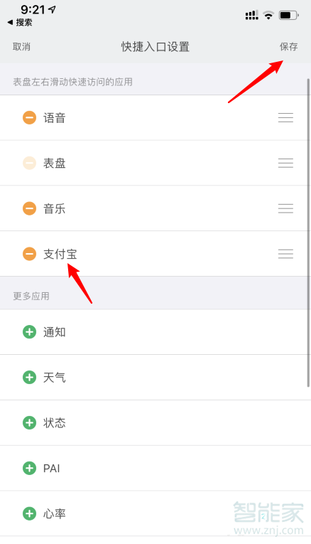 4、点击右上方的【保存】。左右滑动手环屏幕即可进入支付宝付款界面。
