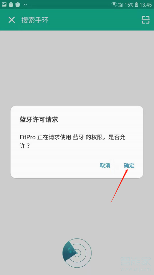 5、在弹出的蓝牙许可请求对话框下点击【确定】,打开蓝牙后搜索即可自动连接到fitpro手环。