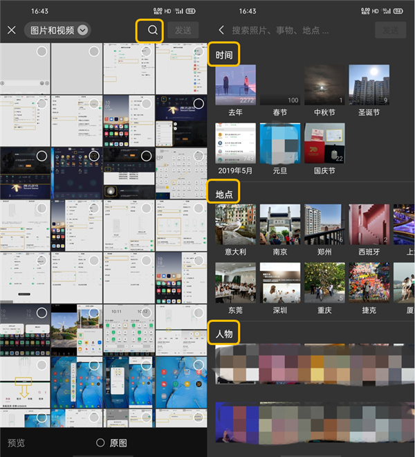 2、点击右上角的搜索图标,进入微信智能选图界面,可以根据时间、地点、人物、智能场景、回忆等快速查找图片。