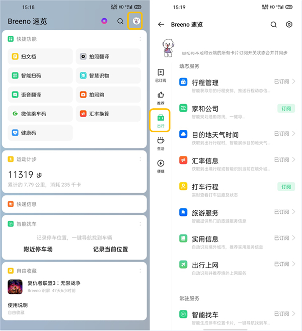 1、通过桌面的【负一屏】—点击右上角头像—【出行】进入以下界面,然后就可以根据个人的需求对相应的小功能进行添加使用哦。